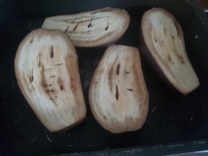 - J ai donc fait cuire 2 belles aubergines, coupées en 2, durant 40min à 180°.