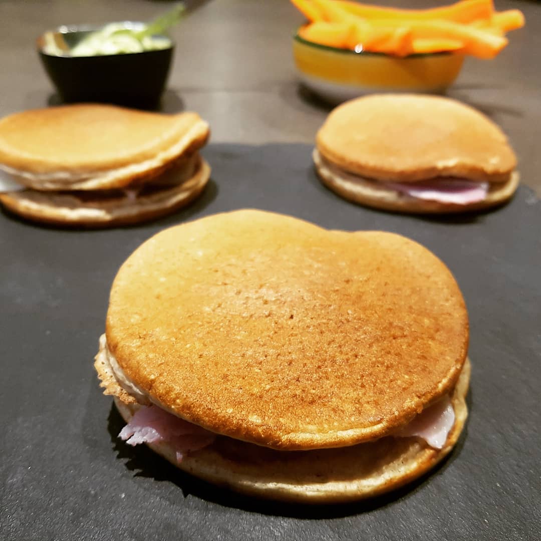 Ma version est hyper simple en fait. Du jambon blanc, du fromage à croque ou de brebis, entre 2 beaux pancakes, mais avec une farine complète svp .