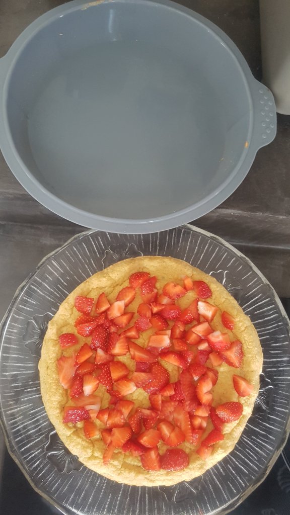 J’ai décoré avec les fraises en tranche et quelques meringues parce que…j’en avais envie !